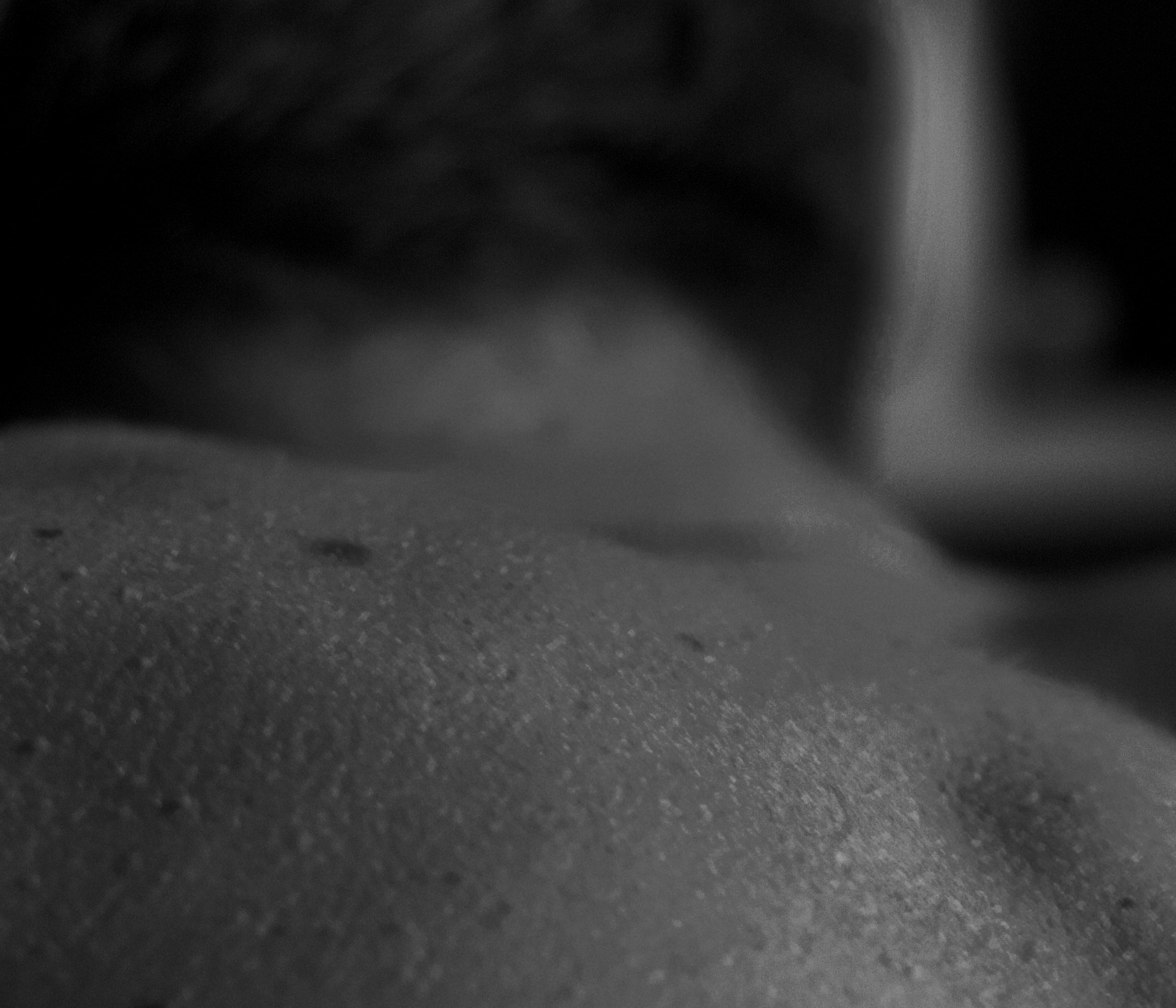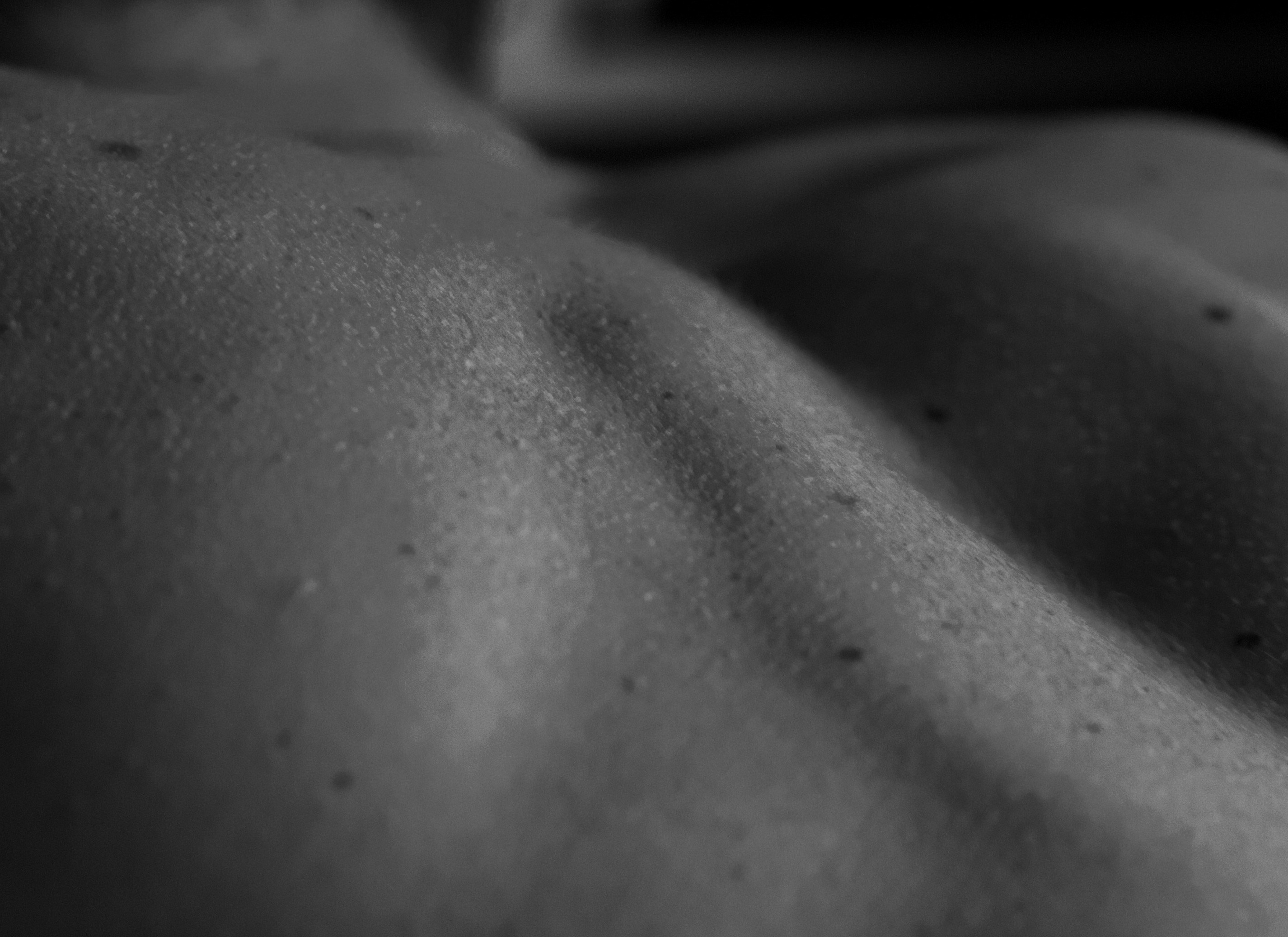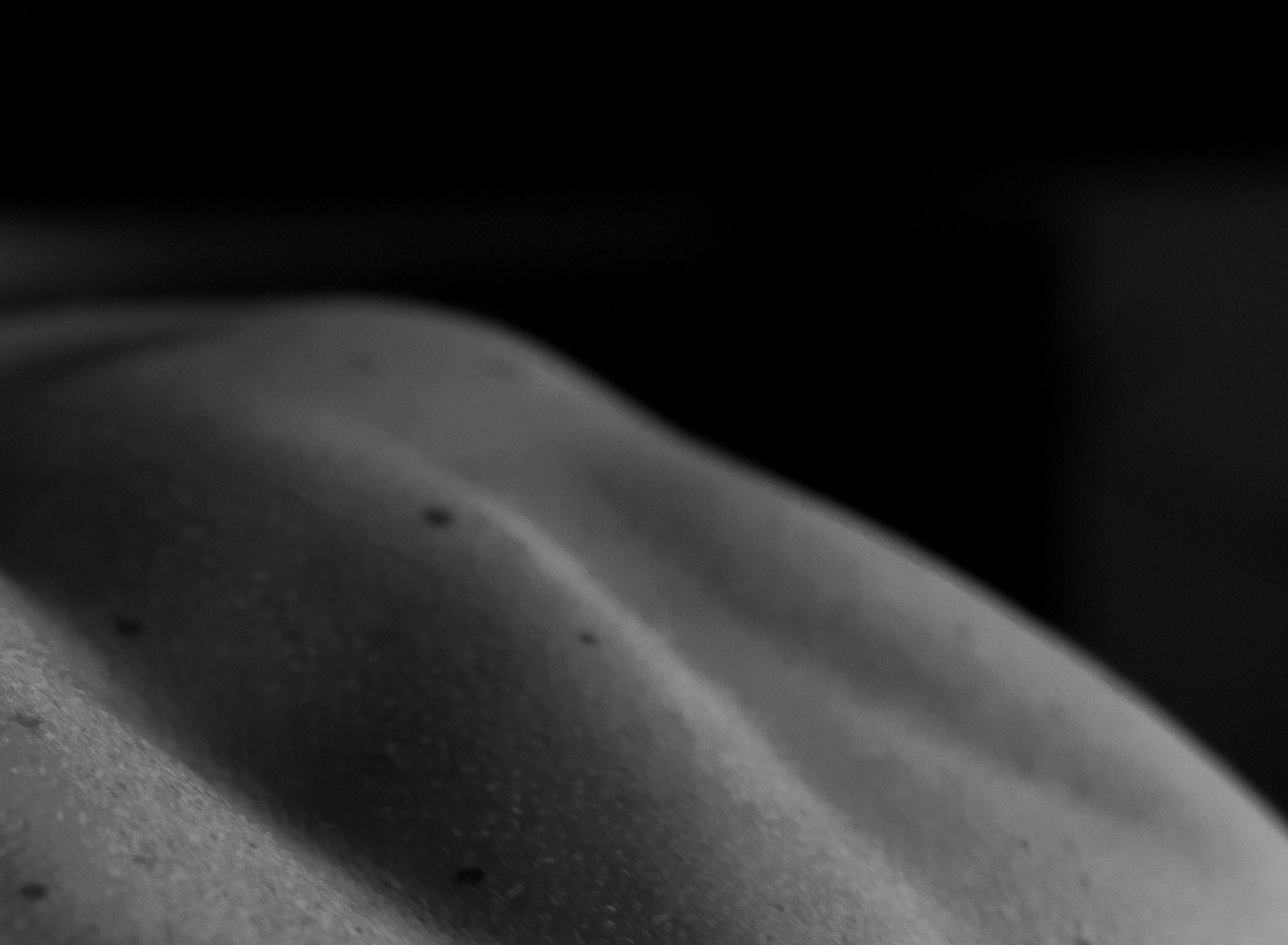 The deltoid catches the raking light like a landscape ridge — the muscular swell carries implicit power and tenderness simultaneously. The gradation from illuminated skin into deep black negative space is painterly, almost Caravaggist.
