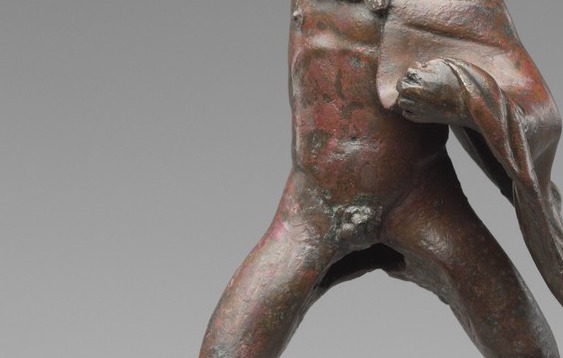 The full diagonal sweep of the lunging body — the counter-twist of torso against legs, the cloak trailing behind like an afterthought. The S-curve of the figure in motion, captured forever in oxidized bronze, carries the erotic weight of a body fully alive in space.