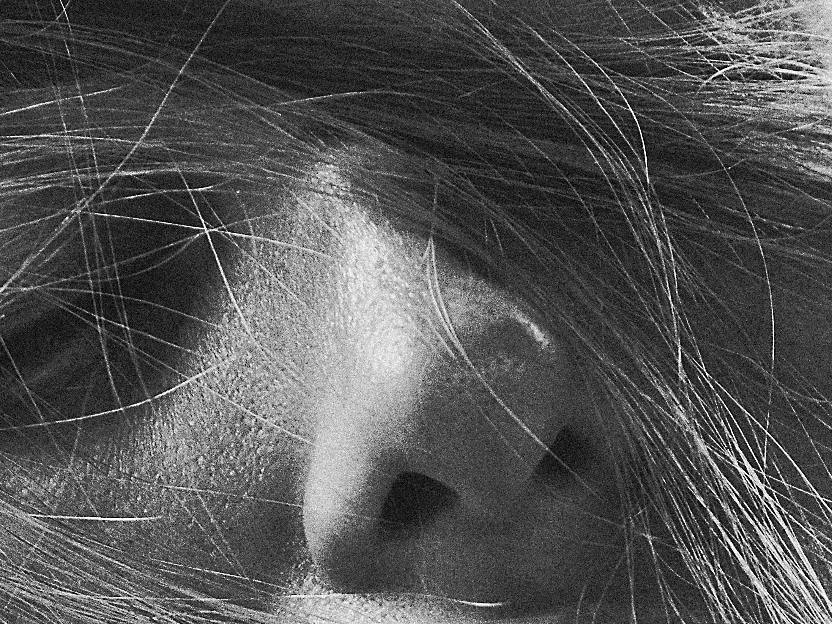 The wild, windswept strands catching light create a veil of chaos across the face — concealment as invitation, the hair functioning as both barrier and intimacy