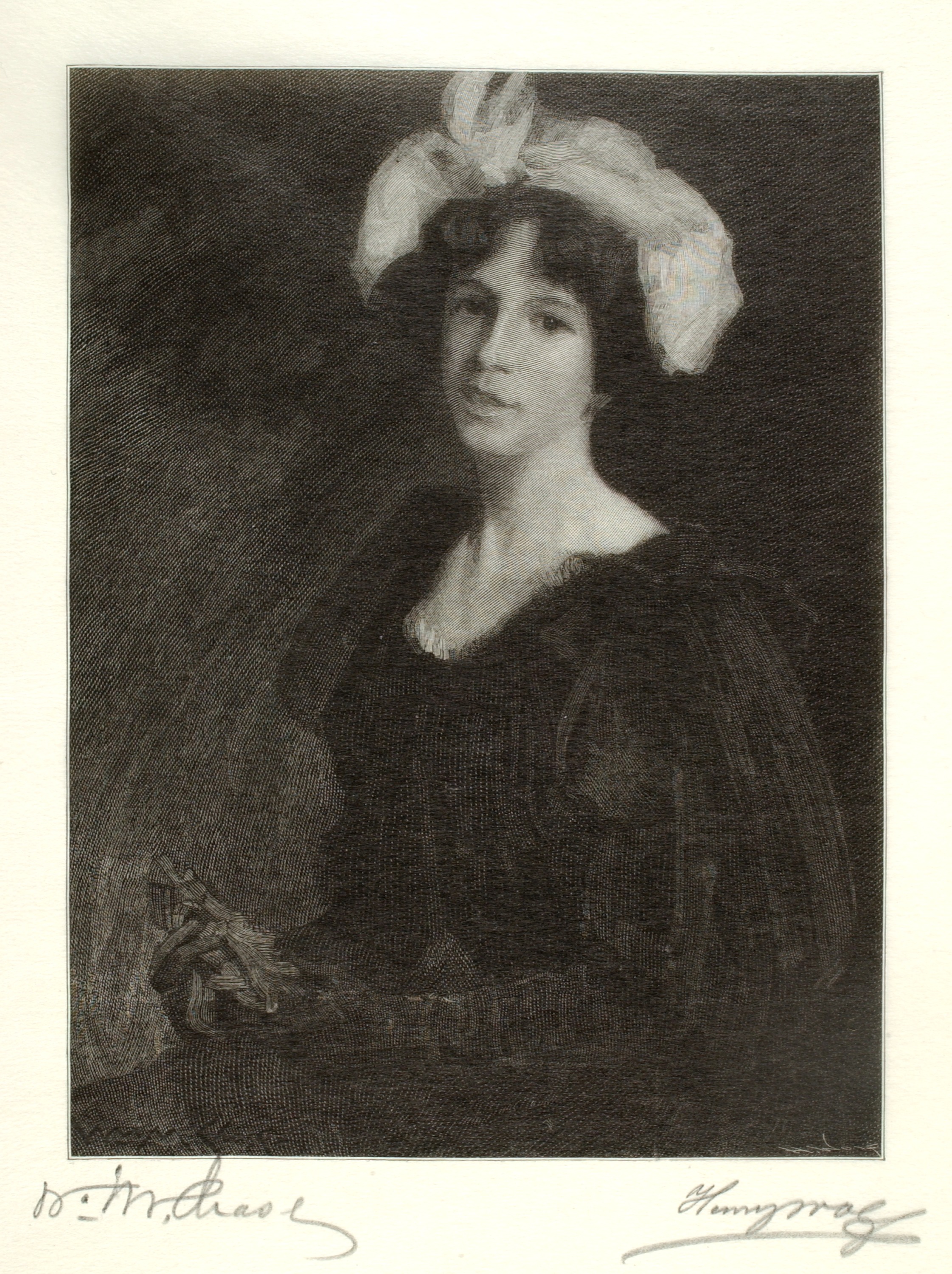 Engraved portrait of a young woman in dark dress with white hair bow against dark background