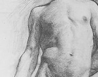 The pectoral plane catching light, one arm pulled behind creating a torsion that opens the ribcage — the body presented rather than posed, with the dark halo of wild hair framing this physical confidence. The musculature is idealized but tender.