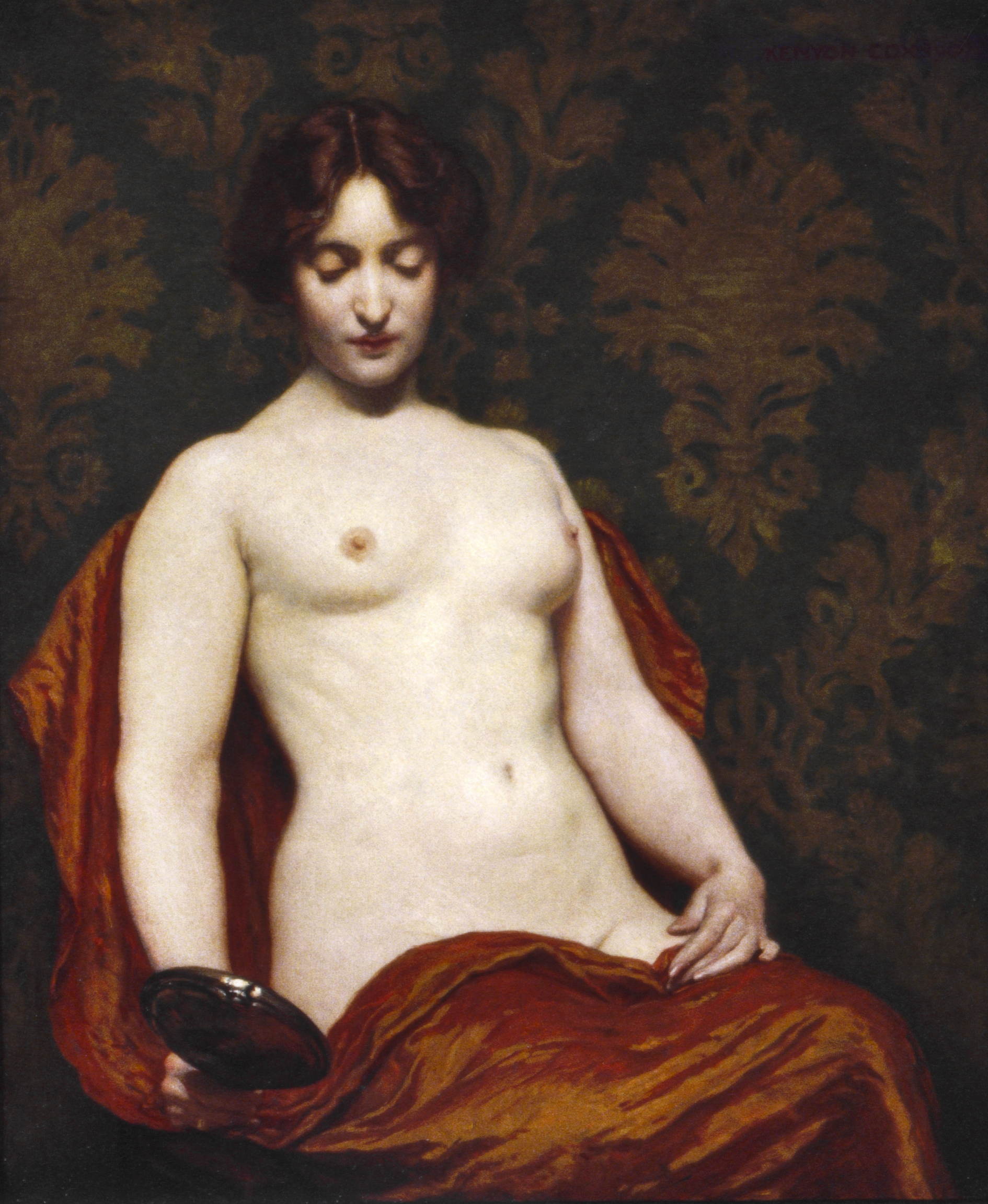 Classical oil painting of a seated woman with red drapery and hand mirror against ornate damask background