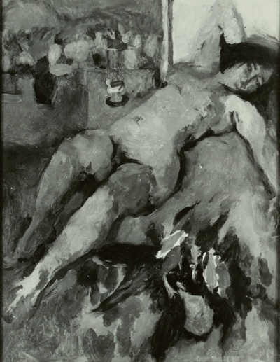Expressionist painting of a reclining nude figure in dark tonal values