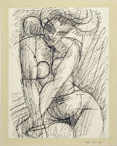 Expressionist ink drawing of a nude female figure seen from behind, rendered in vigorous cross-hatched strokes