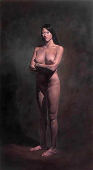 Full-length oil painting of a standing nude woman against a dark background with dramatic chiaroscuro lighting