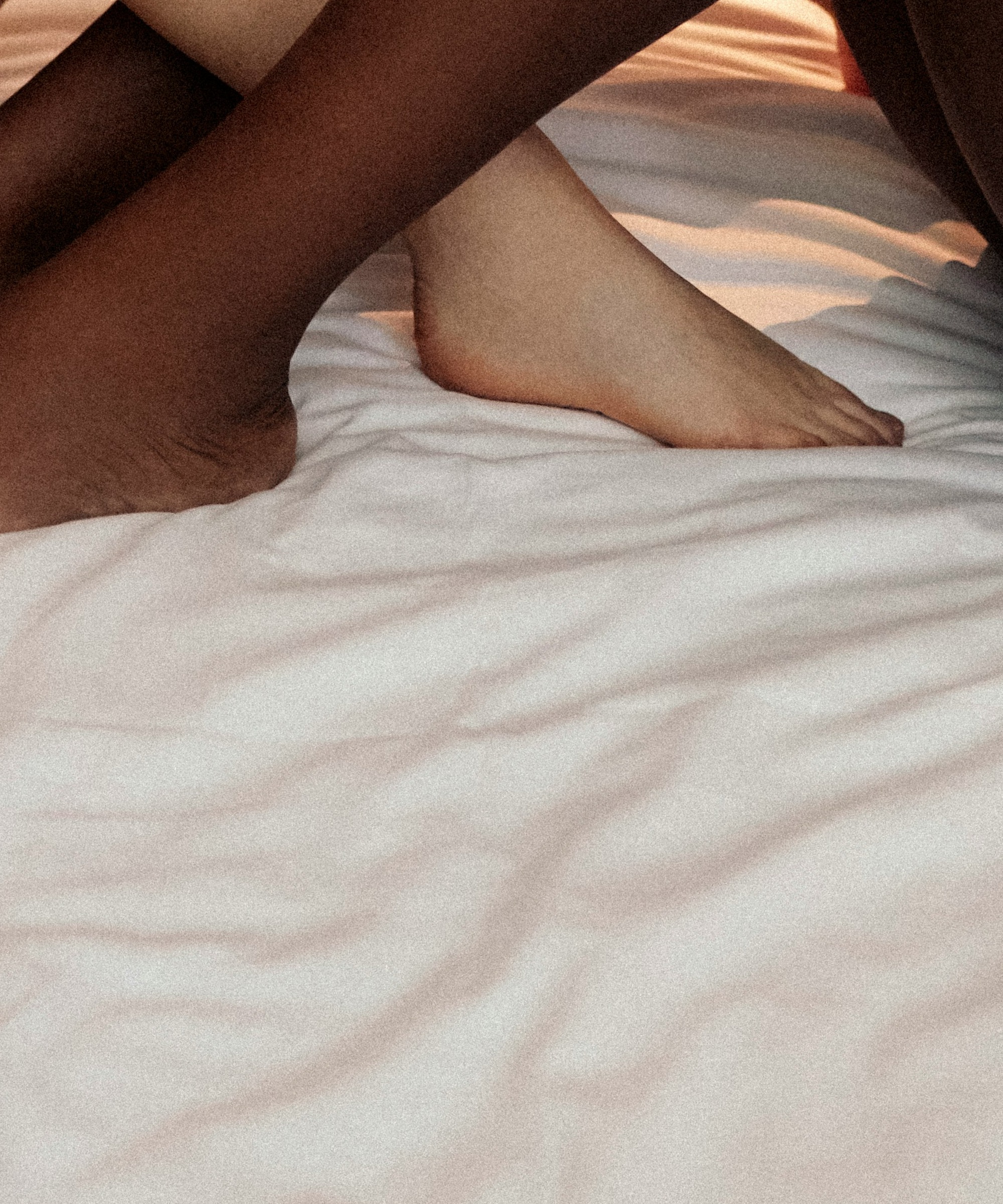 The darker-skinned figure's calves and ankle catching the last slant of golden light — the shin's long line, the relaxed ankle, the warmth pooling on skin like honey. Resolution through the gesture of rest