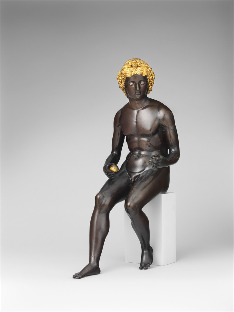 A seated youth concentrates intently as he removes a thorn from his foot, captured in a moment of quiet absorption. Antico masterfully rendered this Renaissance bronze with extraordinary attention to anatomical detail and surface texture. The artist enhanced the naturalistic effect through selective gilding of the hair and silvering of the eyes, creating subtle material contrasts that bring the figure to life. This work exemplifies the Renaissance revival of classical antiquity while demonstrating the period's technical innovations in bronze casting and finishing.