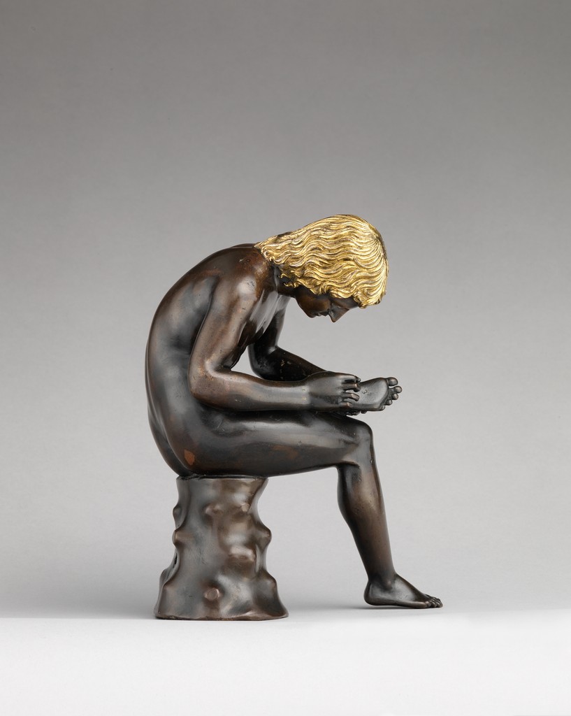 Renaissance bronze sculpture of a seated youth removing a thorn from his foot, with gilt hair