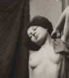 The raised arm gripping the draped fabric overhead exposes the vulnerable inner arm and the stretch of the body's side — the gesture of holding on while leaning away carries erotic tension in its contradiction of strength and yielding