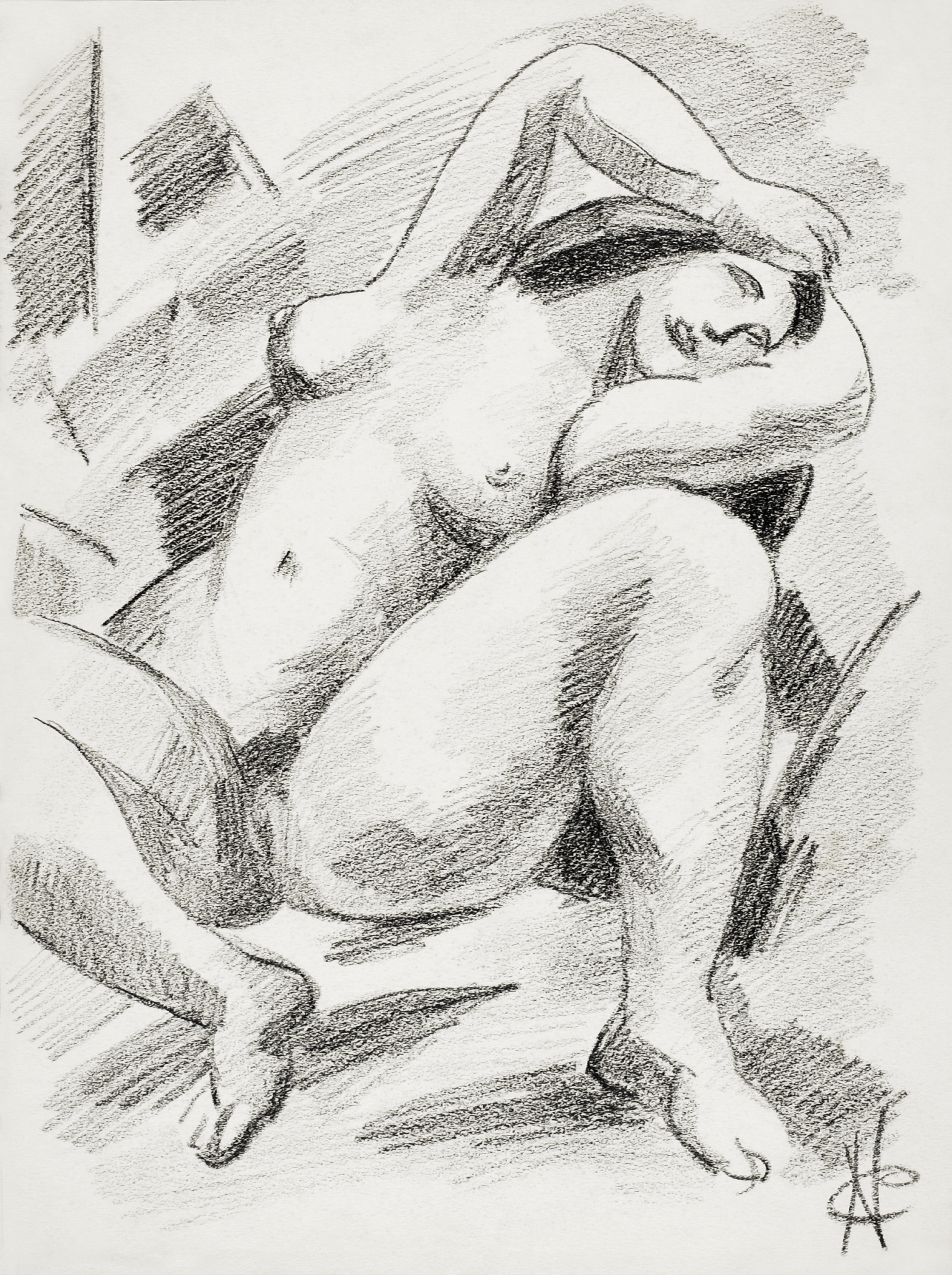 Charcoal figure study of a reclining nude woman in dynamic pose