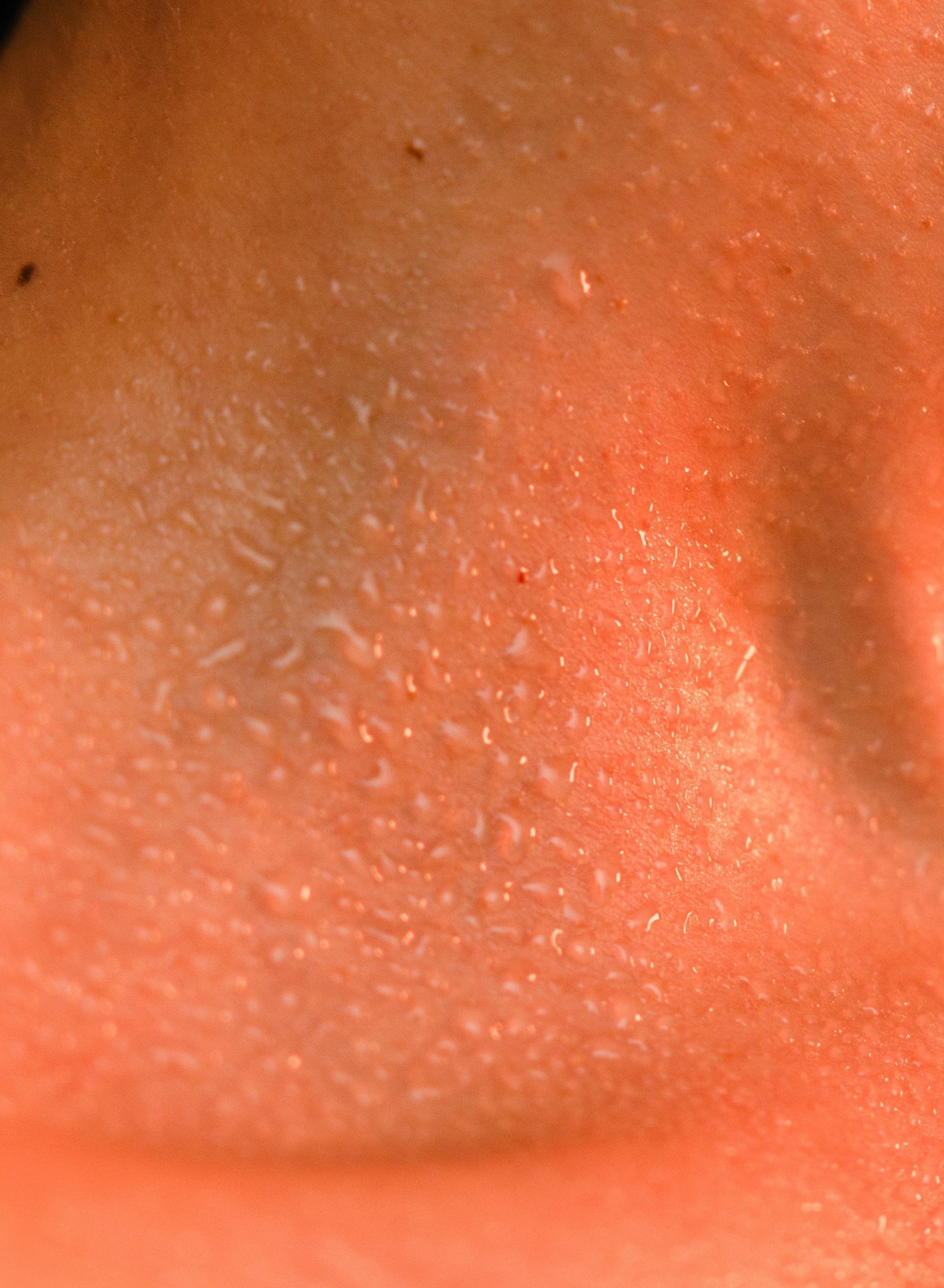 The hollow at the center of the throat — the suprasternal notch implied at the lower edge, the tendons catching light, every droplet of perspiration magnified by the macro lens into something almost obscene in its intimacy. The body's heat made visible.