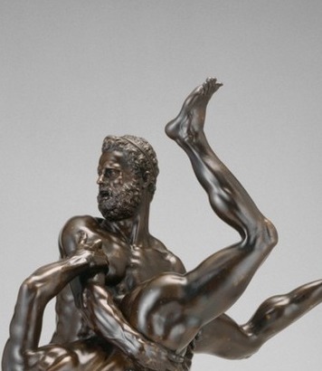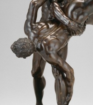 The magnificent arc of the lifted figure's legs sweeping upward — the full curve from inner thigh through calf to pointed foot — traces a line of pure balletic tension against the neutral background. This spiraling form is where violence becomes grace, where struggle becomes dance.